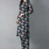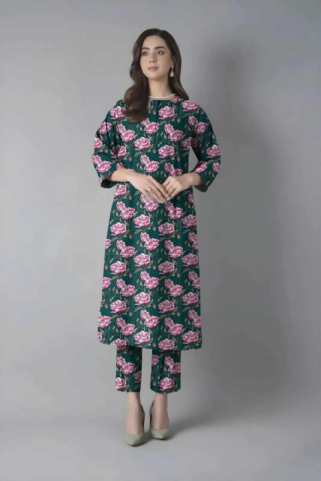 Women’s unstitched printed lawn suit in green color with shirt and trouser fabric, suitable for custom stitching and everyday wear.