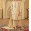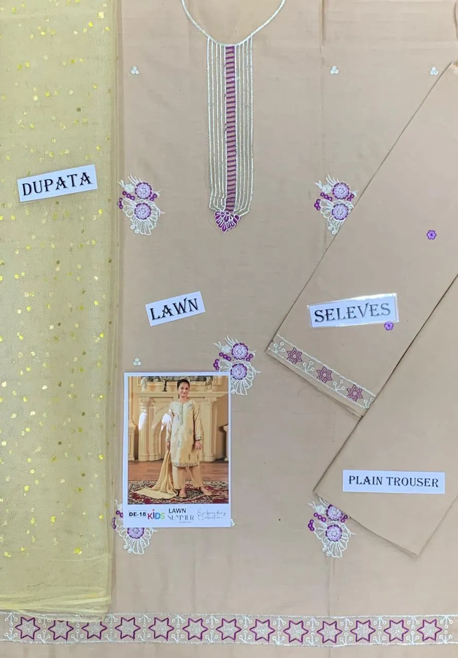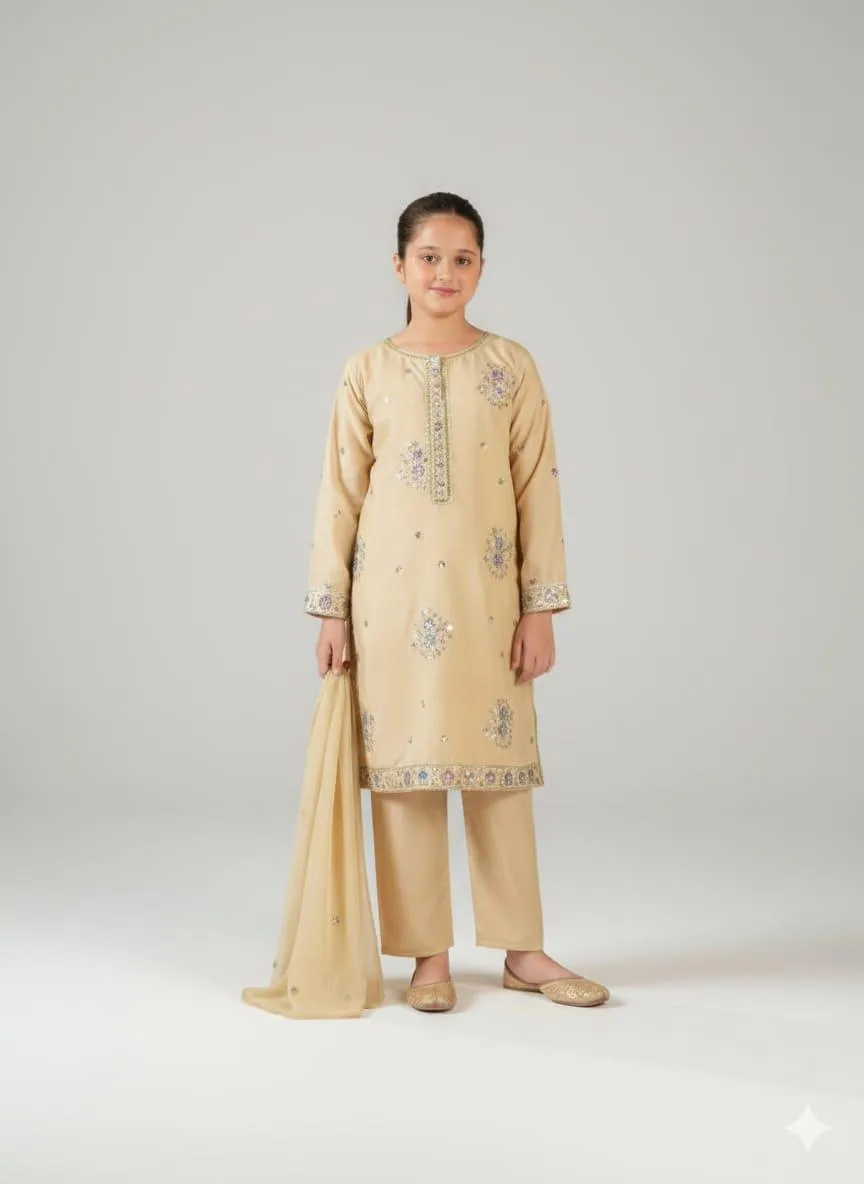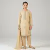Shop 3 Pcs Girls Beige Lawn Embroidered Unstitched Suit with shirt, trouser and dupatta. Available in multiple kids sizes.