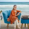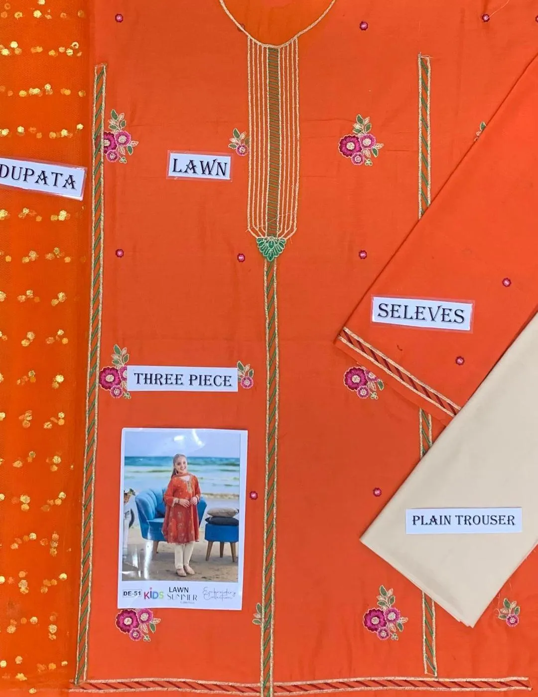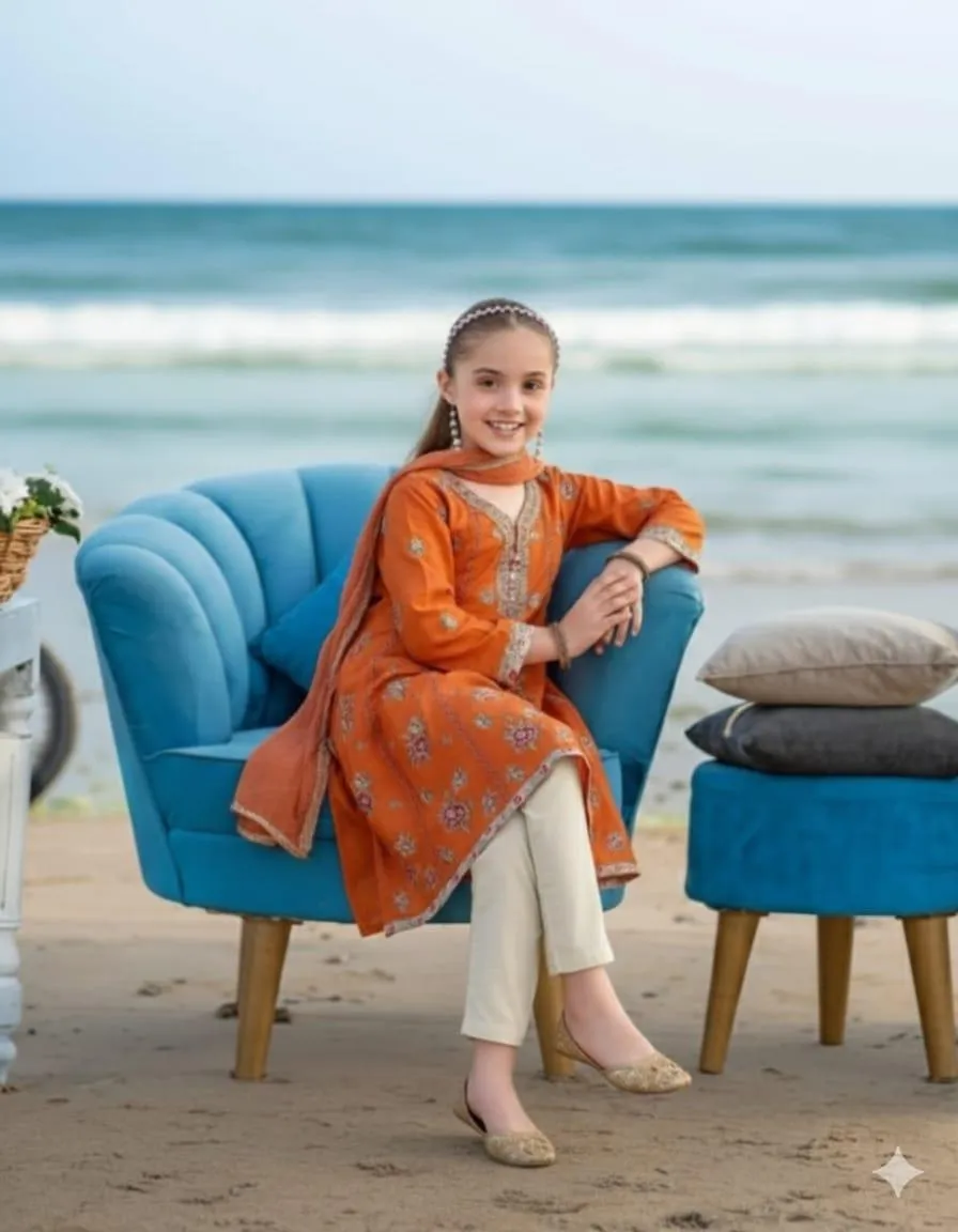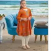Buy 3 Pcs Girls Orange Lawn Embroidered Unstitched Suit with shirt, trouser and dupatta. Available in sizes 3–4 to 8–10 years.