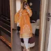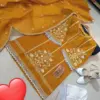 Add a touch of elegance to your wardrobe with this 3 Pcs Women’s Stitched Organza Embroidered Suit in a vibrant mustard shade. This set features a U-neck shirt with intricate white embroidery and lace detailing on the neck, sleeves, and borders, paired with a plain crepe trouser and a 2.5-yard embroidered organza dupatta. The shirt comes with an attached inner for comfort and perfect fit.