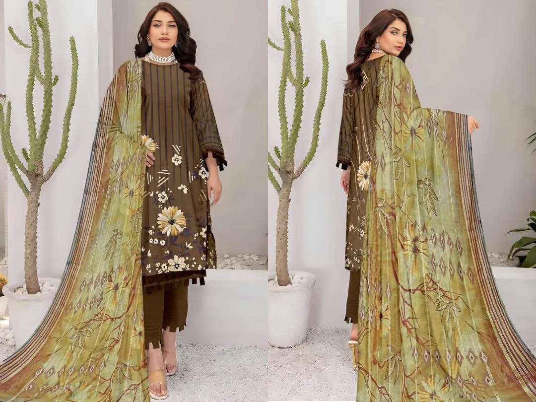 women unstitched suit, 3 pcs printed suit, brown lawn suit, cotton trouser suit, diamond dupatta suit, digital print dupatta, ladies 3 piece suit, unstitched lawn dress