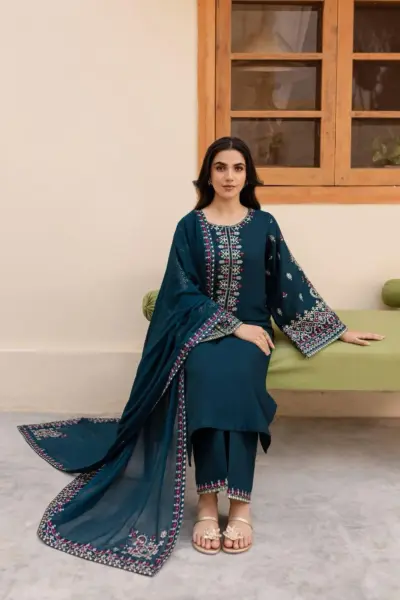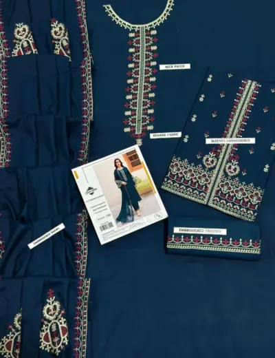 blue 3 piece suit, dhan ak embroidered suit, unstitched blue dress, ladies 3 pcs suit, embroidered dupatta suit, blue winter suit, dhan ak fabric dress, embroidered unstitched suit