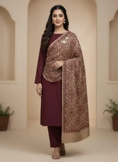 This 3-piece unstitched women’s suit includes a maroon Dhanak shirt and trouser with embroidered neckline and daman, paired with a wool dupatta.