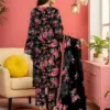 3 pcs women’s unstitched printed lawn suit in black with shirt, trouser, and dupatta. Includes 3.0 meter shirt and 2.5 meter cuts.