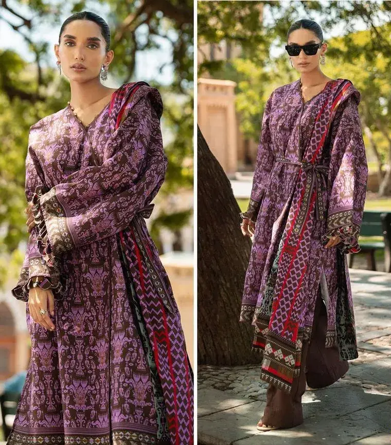 Includes printed shirt, plain trouser, and printed dupatta, ideal for seasonal stitching and Eid collection.