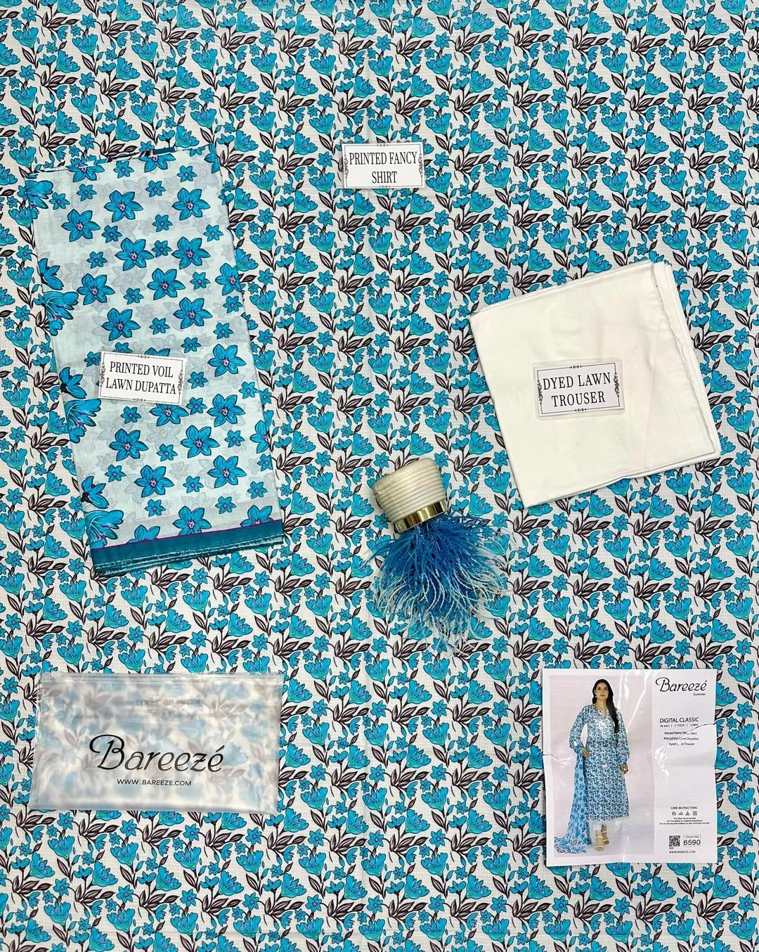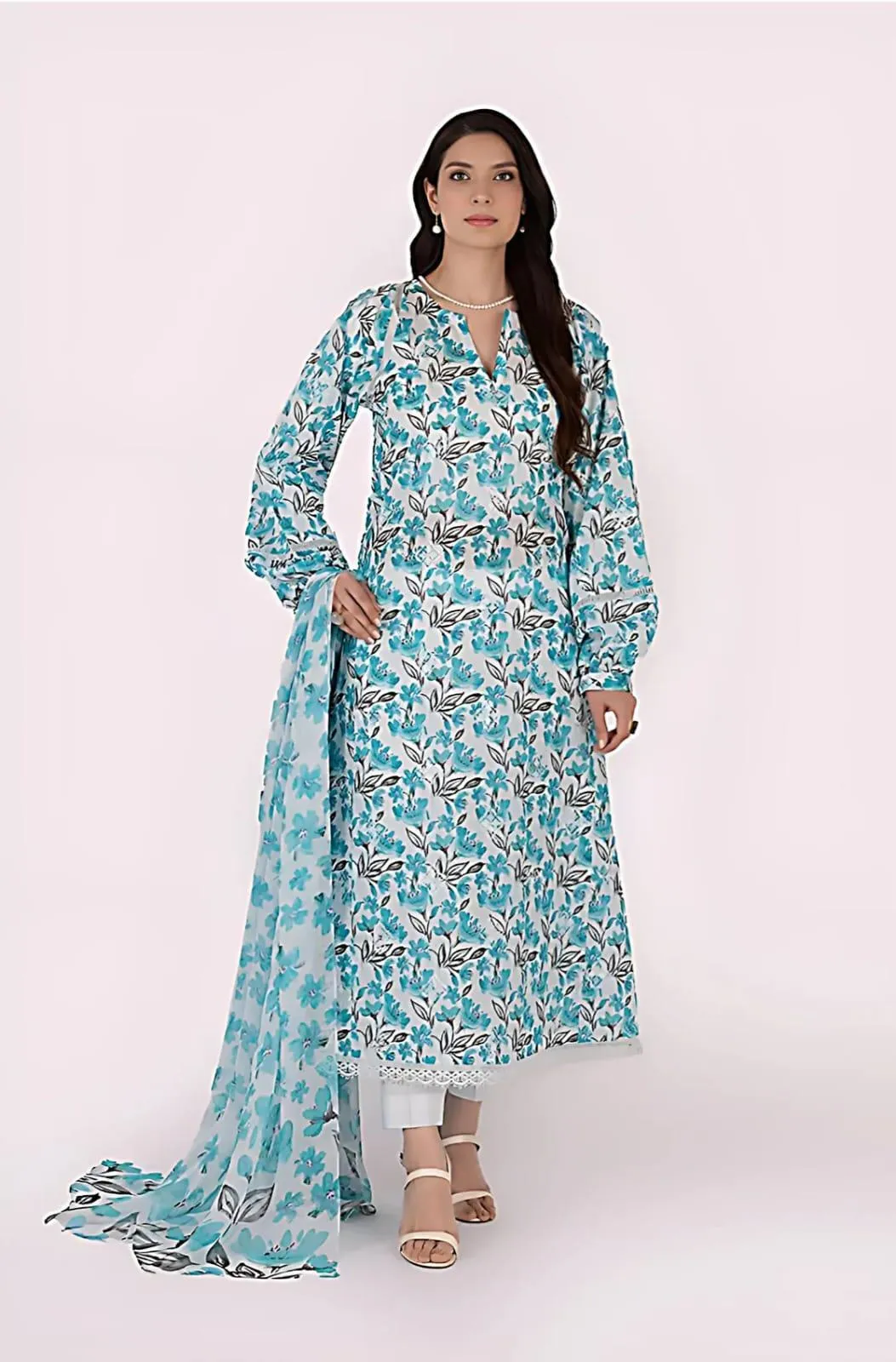 women unstitched suit, 3 pcs lawn suit, blue printed suit, lawn shirt fabric, lawn trouser, dobby lawn dupatta, printed dupatta, ladies unstitched dress