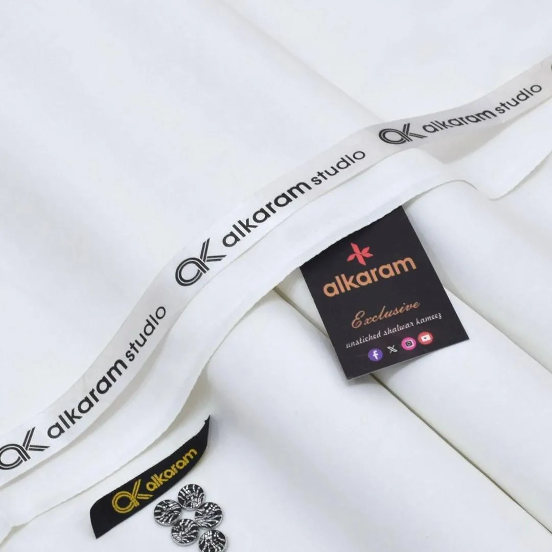 Each package includes 4.5 meters of soft cotton fabric, 8 matching buttons, an Alkaram brand tag, and premium bag packaging, making it suitable for personal use or gifting. With a 100% color guarantee, the suit retains its pristine off-white shade with proper care.
