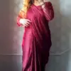 women stitched saree, shamoz silk saree, maroon saree for women, embroidered saree, party wear saree, festive saree, stitched saree Pakistan, saree with blouse, organza blouse saree, designer saree for women