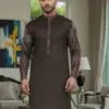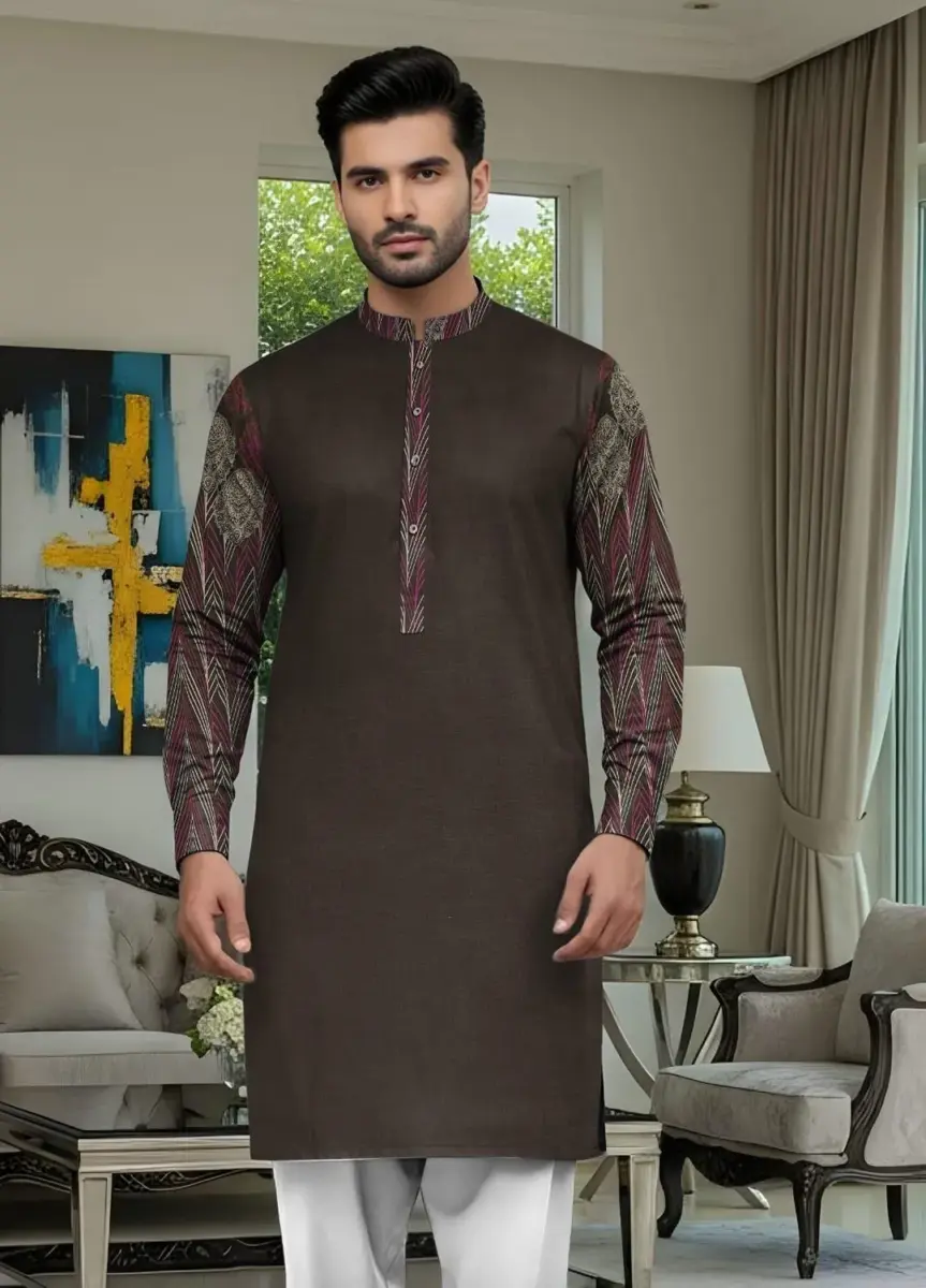 Its self print pattern adds subtle texture and visual depth, making it suitable for everyday wear, cultural events, and semi-formal occasions. The rich brown shade delivers a classic, earthy look that pairs effortlessly with neutral or contrasting trousers and accessories. Because it comes unstitched, this kurta allows tailors and customers to stitch it according to exact body measurements and preferred styles.