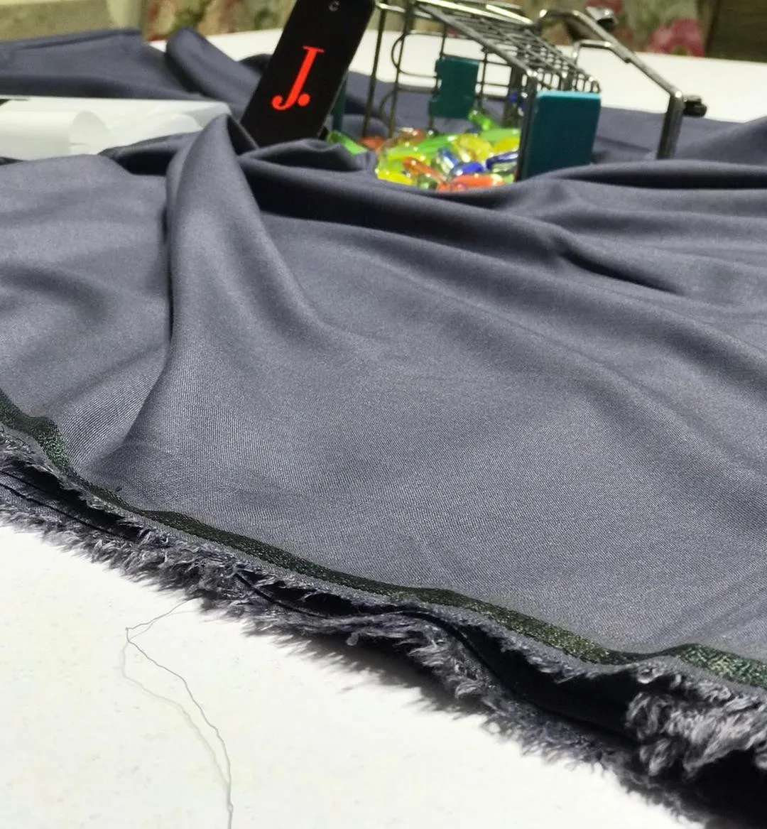 Men’s unstitched wash and wear suit in a plain grey color, suitable for all seasons. Includes shirt and trouser cutting along with brand tag and bag.