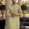 Its self print pattern adds a refined texture that enhances visual appeal without overpowering the design. The vibrant yellow color brings a fresh and modern touch to traditional men’s wear, making it suitable for casual gatherings, cultural events, and seasonal collections. This color is especially attractive for retailers looking to offer variety beyond neutral tones.