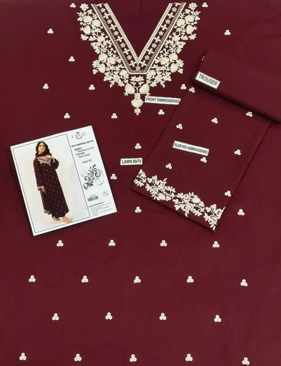 This 2-piece suit balances timeless design with practicality. The unstitched format allows you to tailor the outfit according to your measurements, while premium lawn fabric ensures comfort and elegance. A must-have for women seeking a stylish, comfortable, and versatile wardrobe option in maroon tones.