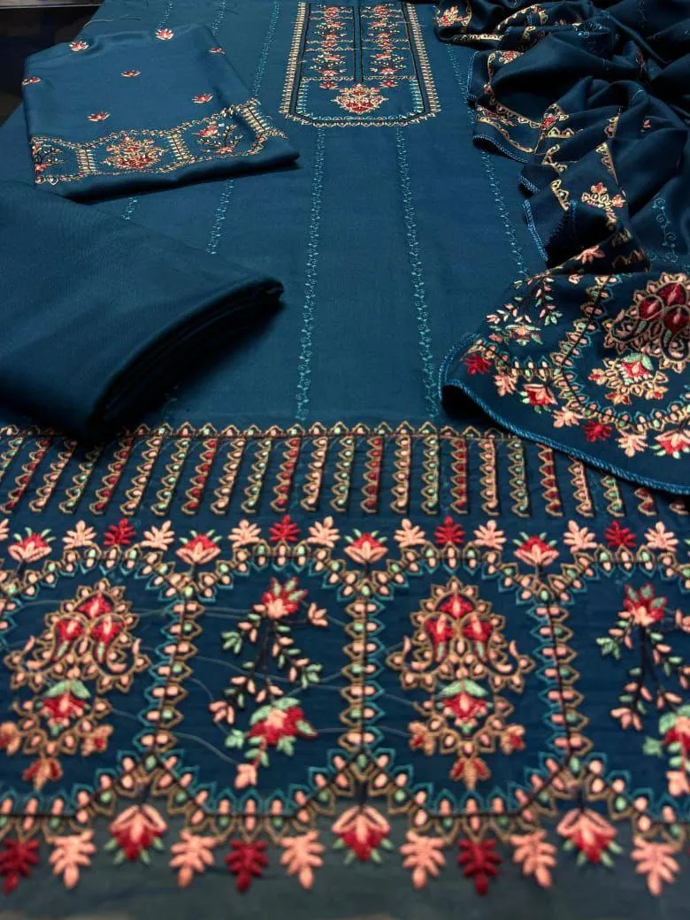 Crafted from high-quality Dhanak fabric, this suit is ideal for cooler weather, offering warmth without compromising on style. The shirt features intricate embroidery on the front, neckline, sleeves, and daman, creating a graceful and sophisticated look, while the plain back ensures balanced elegance. The embroidered Dhanak dupatta adds a luxurious finishing touch, making it suitable for casual wear, semi-formal gatherings, and festive occasions.