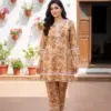 The printed khaddar frock features a graceful flow that flatters the silhouette, offering both comfort and a feminine look. Paired with a matching khaddar trouser, this ready-to-wear 2-piece suit eliminates the need for tailoring—simply wear and go. The brown color adds a classic, earthy charm that works beautifully for winter wardrobes and can be easily styled with shawls, cardigans, or winter accessories.