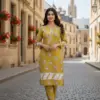 Women’s 2-piece stitched shirt and trouser set in yellow color.
