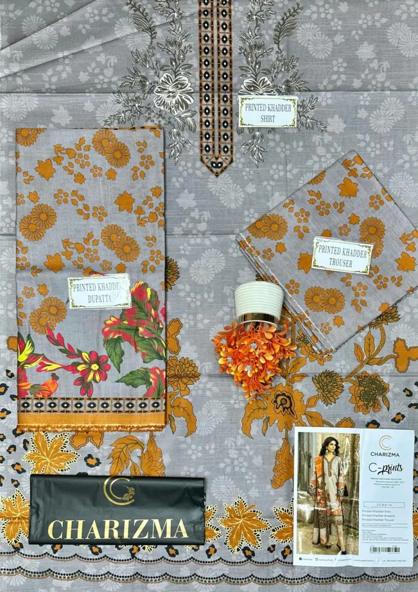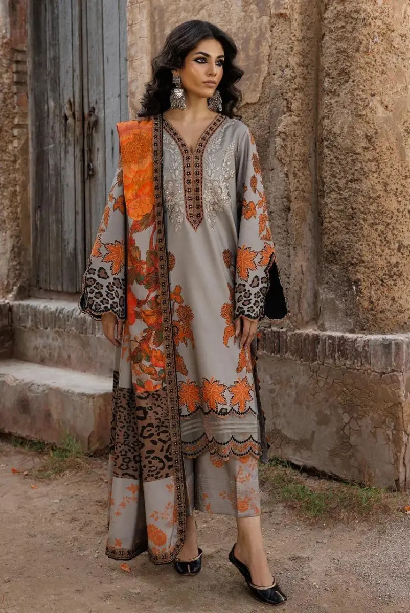 women khaddar suit, grey unstitched suit, printed khaddar suit, winter women suit, 3 pcs unstitched suit, Pakistani women clothing