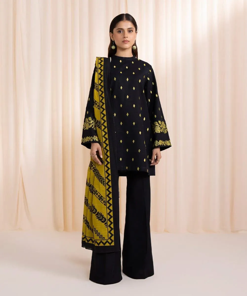 The classic black color makes this suit a versatile wardrobe essential, easy to dress up with statement accessories or keep minimal for an elegant daytime look. With 2.5 meters cutting for the shirt, trouser, and dupatta, you get complete flexibility to stitch the suit according to your preferred fit and design.