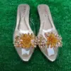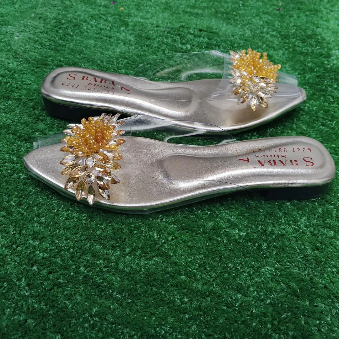 women transparent slippers, golden gemstone flats, pvc half slippers women, fancy women flats, casual women slippers, semi-formal slippers women, party flats women, stylish women footwear, comfortable pvc slippers, versatile women shoes